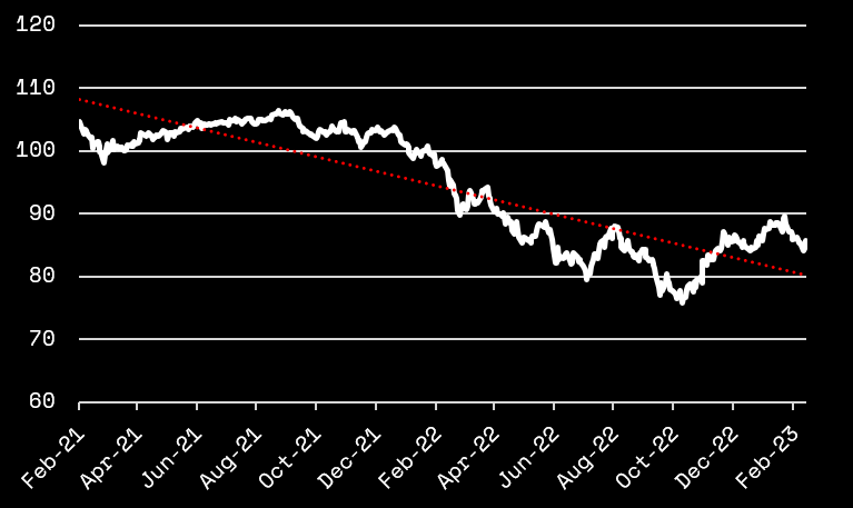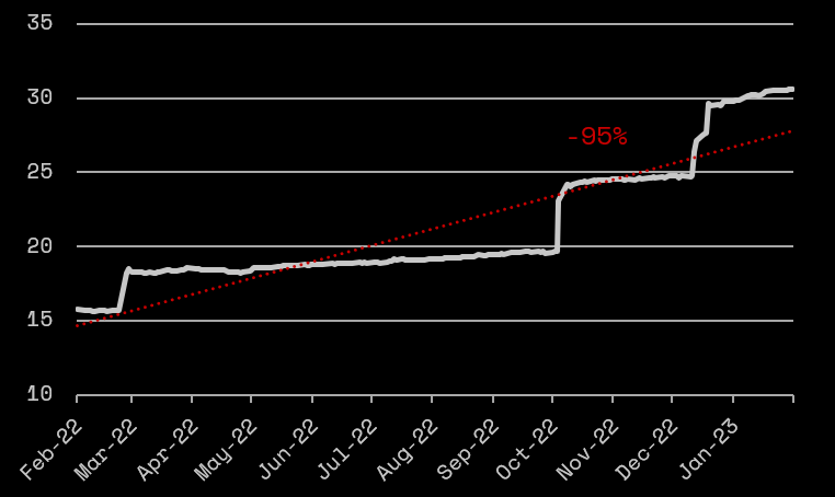 The Russian-Ukrainian war did not stop at increasing risks related to EM Bonds, but also sent EM Bond indices into a very weird position. Due to the sanctions package applied on Russia, corporate bonds and Russian government bonds defaulted due to them not having the ability to disburse required payments. This sent prices of Russian bonds crashing to never-seen-before lows. While this might seem Russia specific, Russia makes up a very big chunk of EM indices, on both equity and debt side, which sent EM indices into a massive slump as shown by the chart below